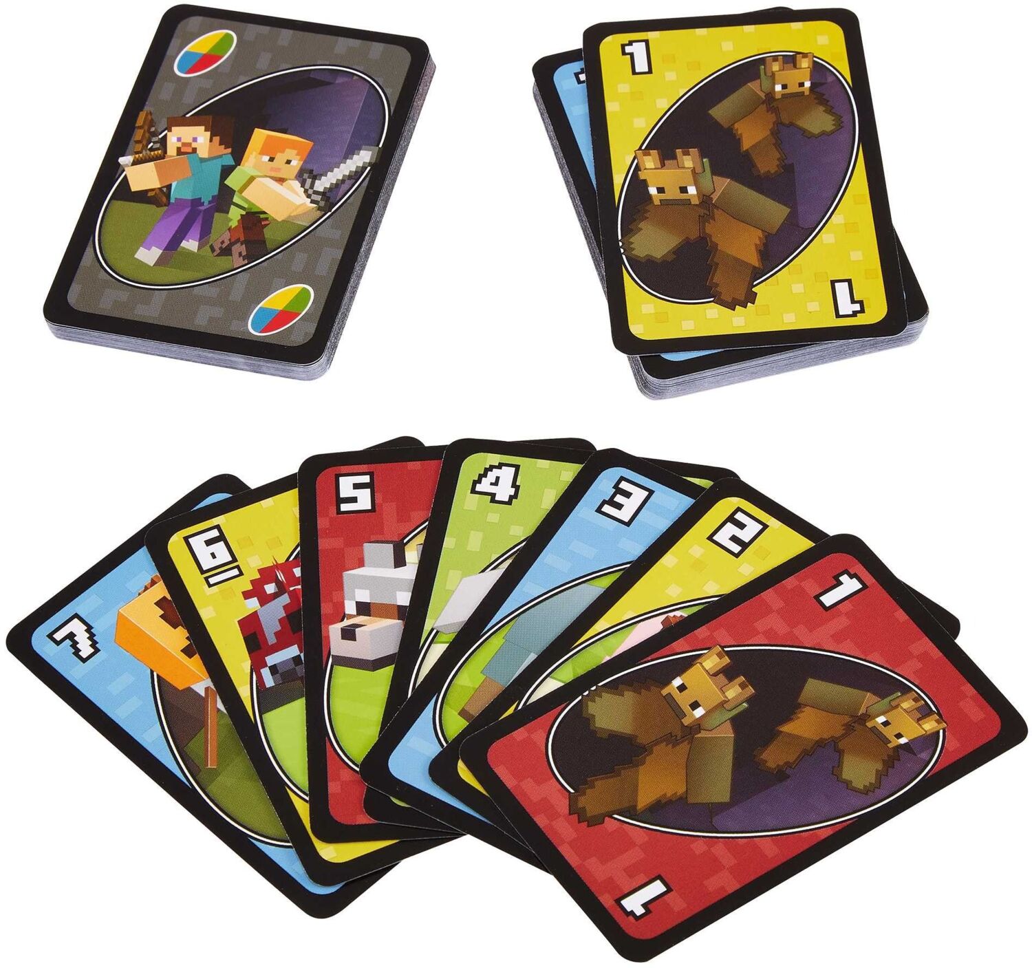 Карткова гра UNO Minecraft ідеально підходить для великих і малих компаній від 2 до 10 гравців віком від 7 років. Яскраві та вигадливі дизайни Minecraft захоплять усю родину!