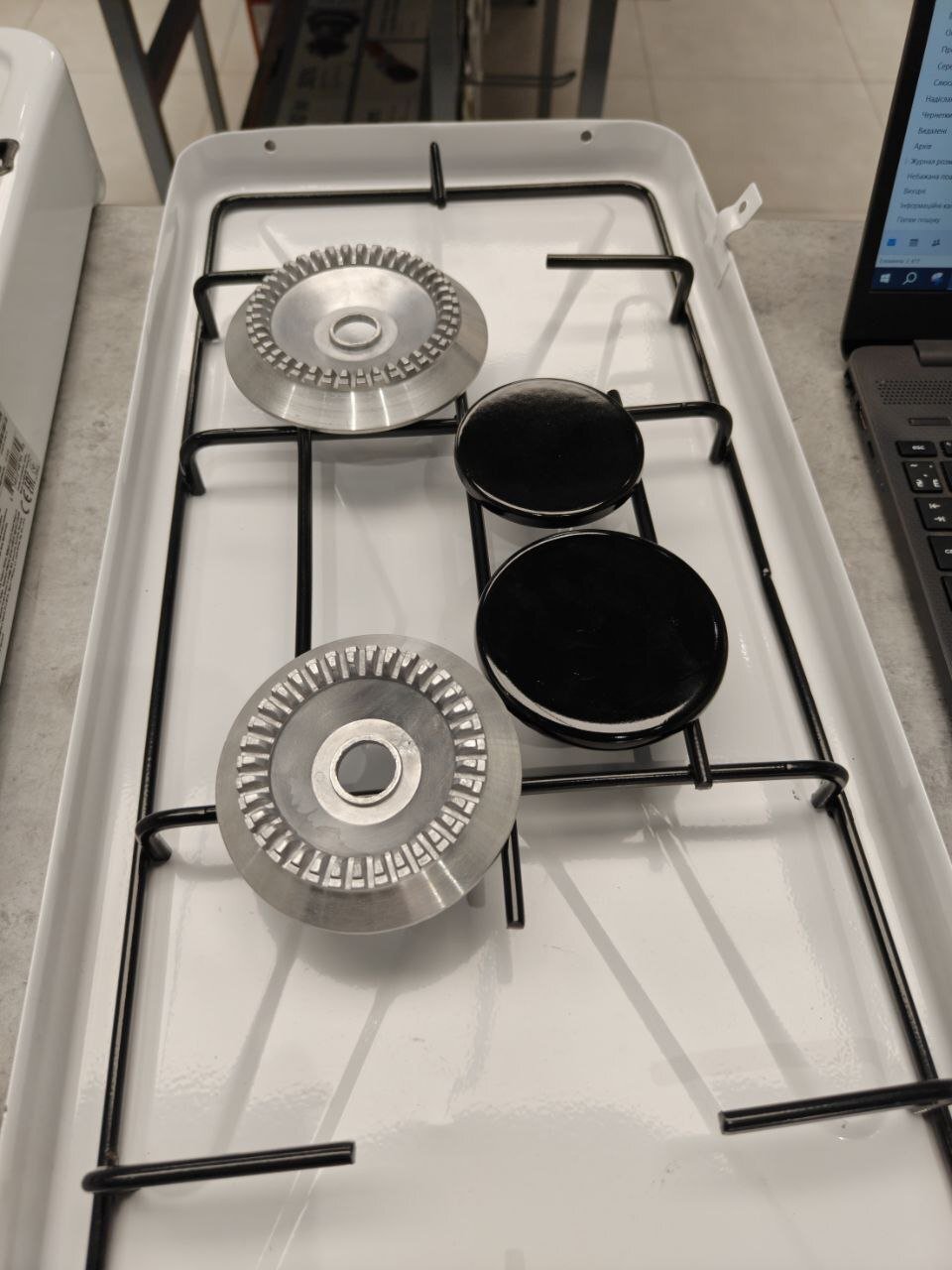Придбала для бабусі та загалом великої сім'ї, бо часто гостимо кілька днів, а часом і тиждень. Три дочки, три сім'ї) Тому плита вибиралася нехлипка та продуктивна, щоб готувати було комфортно. І не прогадала! Плита тішить. Виглядає як на фото. Відстань між конфорками дозволяє одночасно ставити дві повномірні/середні сковороди/каструлі без тісноти, можна спокійно і велику поставити. Потужності конфорок вистачає для комфортного приготування першого та другого. Немає відчуття, мовляв, скільки можна закипати чи смажитися, ось немає такого. Навпаки, цілком швидко. Коли встановите, потрібно хвилин тридцать, аби конфорки розгорілися і дали вже рівномірно добре працювали/палали.