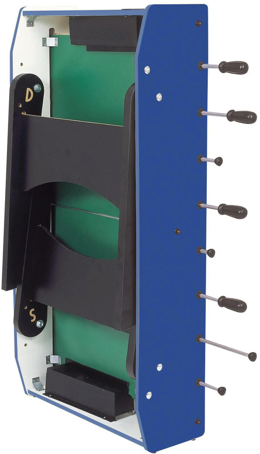 - Ігрове поле із ламіната на основі ДСП зі скошеними кутами. Білі лінії на зеленому тлі нанесені методом шовкографії, відтворюючи футбольне поле.