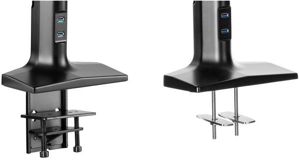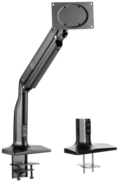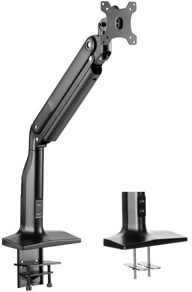 Підставка для монітора з вбудованим USB-хабом на два порти стандарту 3.0. Кронштейн підставки оснащений надзвичайно зручним і оптимальним кріпленням і не займе багато місця на робочій поверхні. За допомогою системи прокладання кабелів усі дроти можна акуратно зібрати разом. Підставка підходить для моніторів діагоналлю від 17″до 43″ і витримує навантаження до 18 кг. Спеціальний пружинний механізм із можливістю регулювання дає змогу самостійно налаштовувати оптимальну позицію монітора - нахил/поворот/обертання.