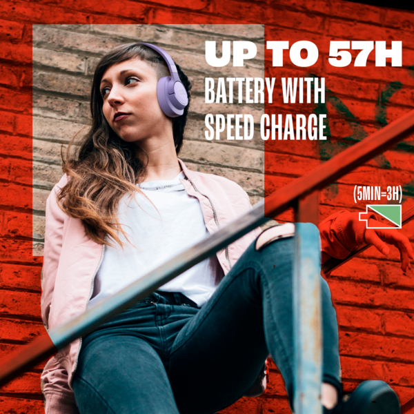 Для тривалого задоволення слухайте бездротовим способом до 76 годин і заряджайте акумулятор всього за 2 години за допомогою зручного USB-кабелю Type-C. Швидка 5-хвилинна підзарядка забезпечить вам 3 додаткові години музики.