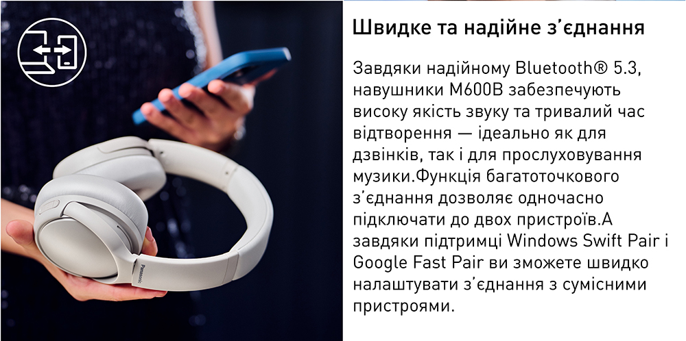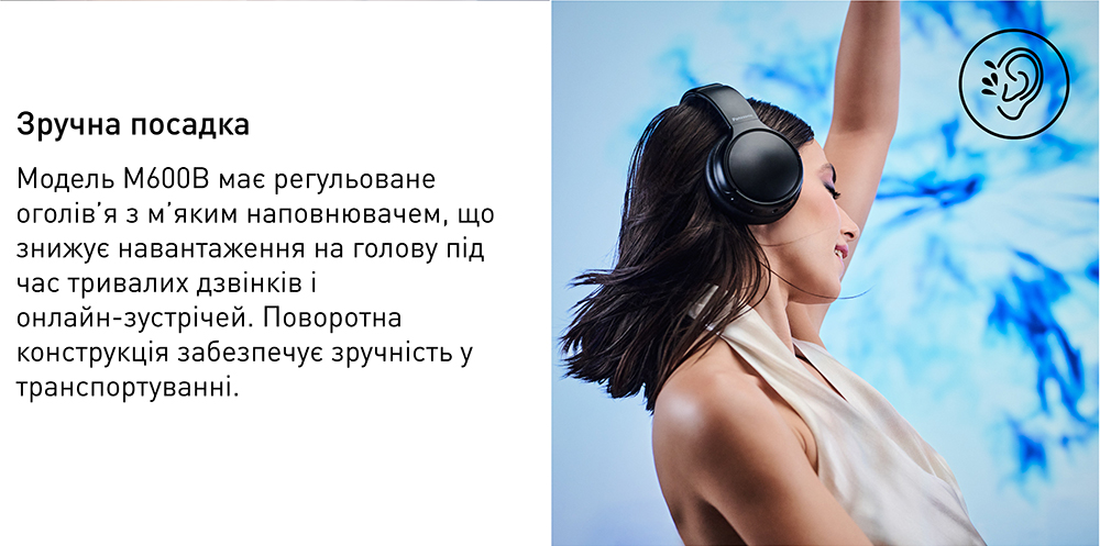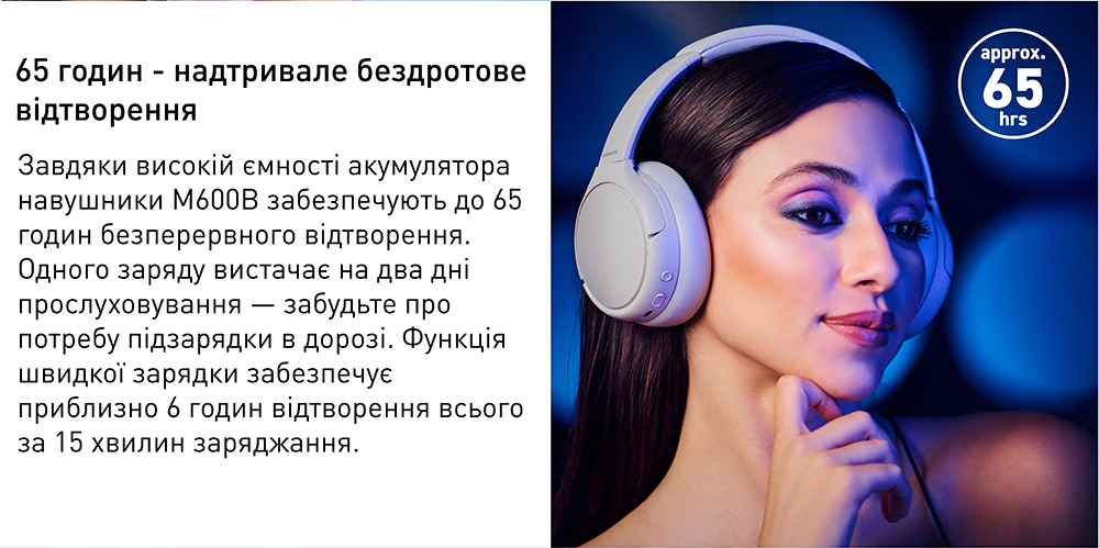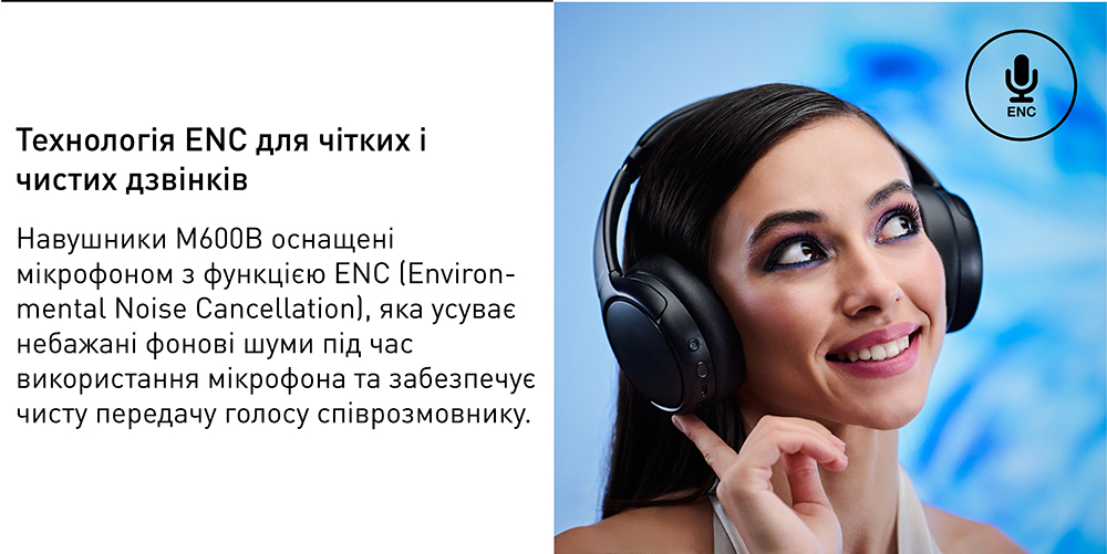 M600B забезпечують чітке глибоке звучання басів і динамічний звук без небажаних шумів, а також до 65 годин безперервного бездротового відтворення. Навушники мають м’які амбушюри та мікрофон з технологією ENC для усунення шумів — ідеально підходять для онлайн-дзвінків.
