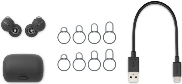 До комплекту навушників LinkBuds входять дуги для фіксації п’яти розмірів і кабель USB-C для заряджання.