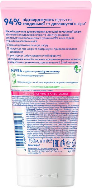 Представлений крем-гель Nivea створений для ефективного і делікатного очищення чутливої і сухої шкіри від забруднень, надлишків жиру і залишків макіяжу. Він забезпечує шкірі обличчя чистоту, зволоженість і м'якість. Засіб має нежирну густу консистенцію білувато-рожевого кольору. Продукт має дуже приємний аромат, властивий кремам для обличчя цієї лінії, солодкуватий, з квітковими нотками. Він дбайливо позбавляє подразнень і стягнутості, ніжно очищає, підтримуючи природний рівень зволоженості завдяки спеціальній формулі. У складі гелю мигдальна олія, яка заспокоює шкіру, дозволяючи їй залишатися м'якою і бархатистою.