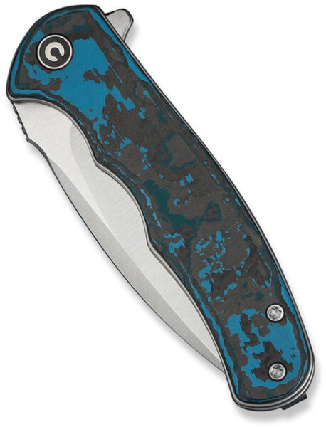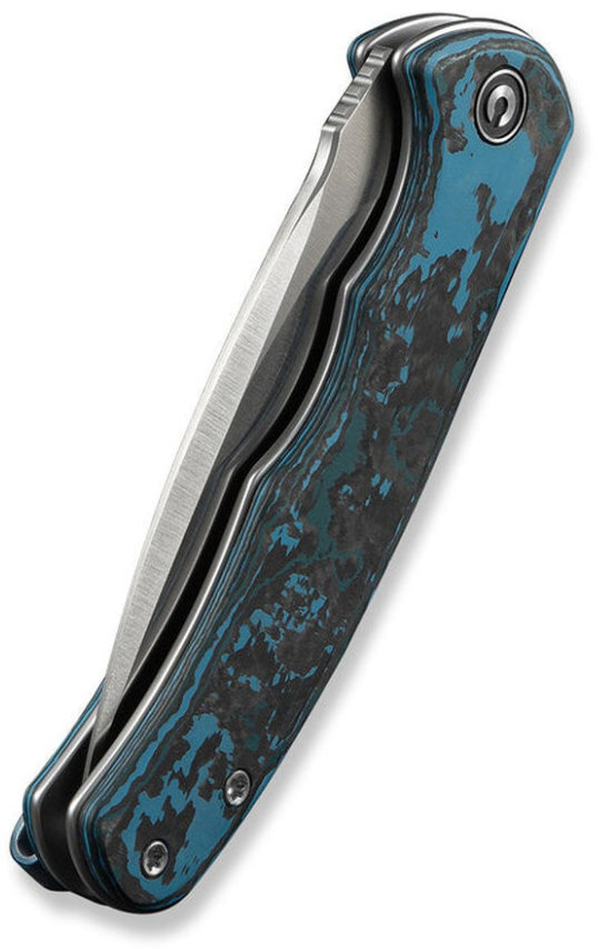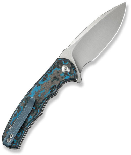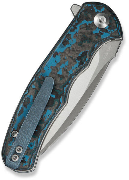 Кліпса з титану 6AL4V. Затискач пропонує максимально щільну фіксацію ножа на кишені або поясі у положенні Tip-Up. Титан не піддається іржавінню, зношуванню та доповнений синім анодуванням як акцентна деталь у колірній палітрі ножа. Відкриття здійснюється за допомогою сталевого плавця фліпера. Керамічні підшипники в осьовому вузлі забезпечують мінімальне тертя та пришвидшують відкривання конструкції.