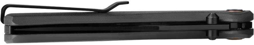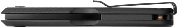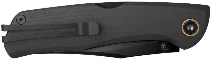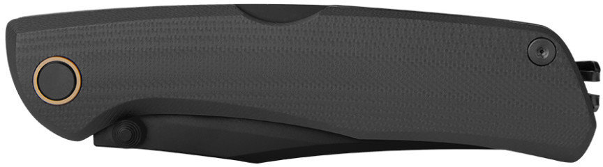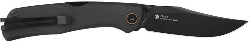 Клинок з нержавіючої сталі Sandvik 12C27, загартованої до 57-59 HRC, легко заточується та надовго зберігає гостроту кромки, а чорне покриття підвищує антикорозійні властивості та усуває блиск металу. Профіль клинка з прямим заточуванням і подовженим вістрям однаково гарний як для різання, так і для проколювання.