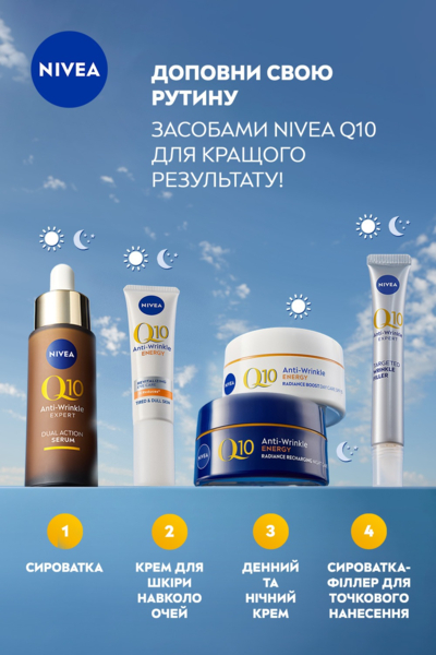 Схожі товари Нічний крем Nivea Q10 Energy відновлення сяйва кульковий 50 мл