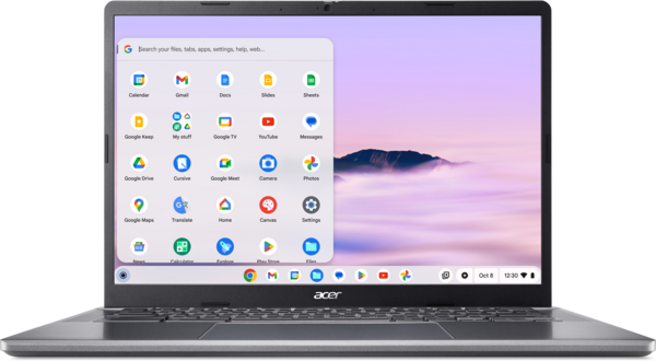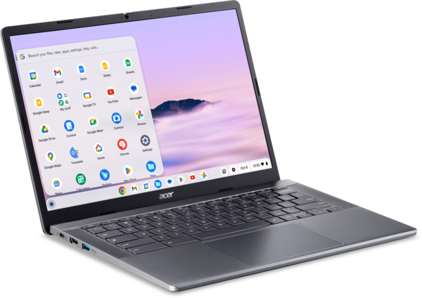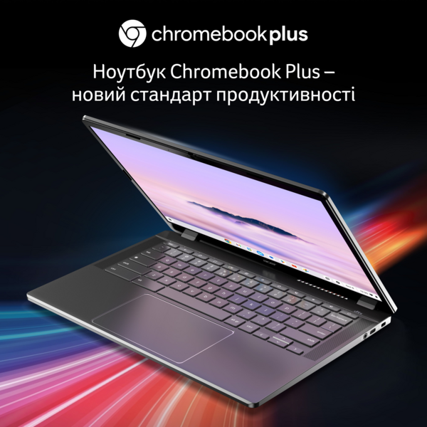 Ноутбук Chromebook Plus приємно здивує своєю продуктивністю. Він вирізняється вдвічі більшими обсягом пам’яті та місткістю накопичувача. Крім того, пристрій підтримує програми від компаній Adobe і Google на основі штучного інтелекту, які відкривають перед користувачами безліч нових можливостей.