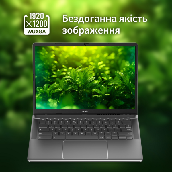 Ноутбук Chromebook Plus оснащено великим екраном формату Full HD із діагоналлю 14 дюймів і вузькою рамкою. Користувачам буде зручно працювати з пристроєм навіть за яскравого освітлення.