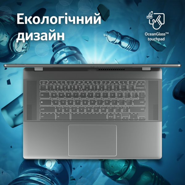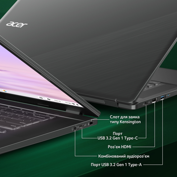 Ноутбук Chromebook Plus оснащено великим екраном формату Full HD із діагоналлю 15,6 дюйма та вузькою рамкою. Користувачам буде зручно працювати з пристроєм навіть за яскравого освітлення.