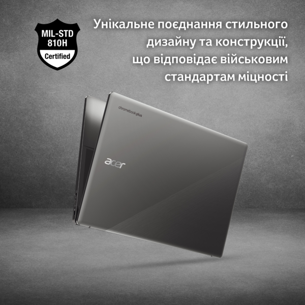 Де б не опинилися користувачі, вони зможуть працювати, не переймаючись безпекою пристрою. Ноутбук Chromebook Plus з честю пройшов випробування на відповідність суворим вимогам військового стандарту міцності MIL-STD-810H у незалежній лабораторії.