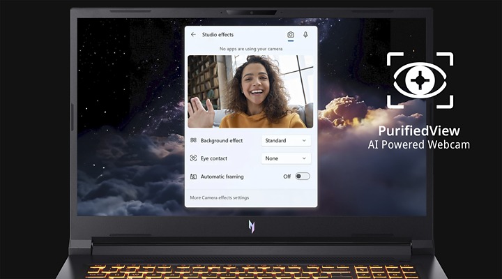 Користуйтесь функціями автоматичного кадрування, вдосконаленого розмиття фону та корекції погляду для відеодзвінків із підтримкою ШІ, а також функцією Acer TNR, що забезпечує чіткіші зображення за умов низької освітленості.