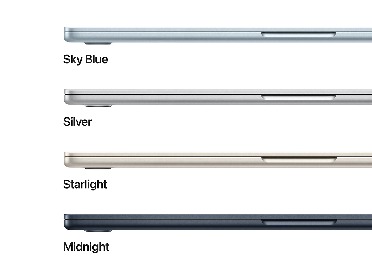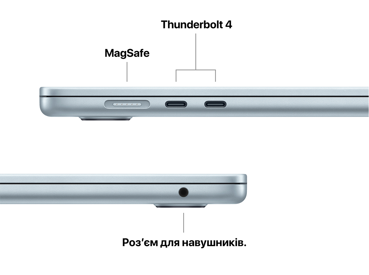MacBook Air оснащено двома портами Thunderbolt 4, зарядним портом MagSafe, портом для навушників, Wi-Fi 6E та Bluetooth 5.3. А ще до нього можна підʼєднати до двох зовнішніх дисплеїв.