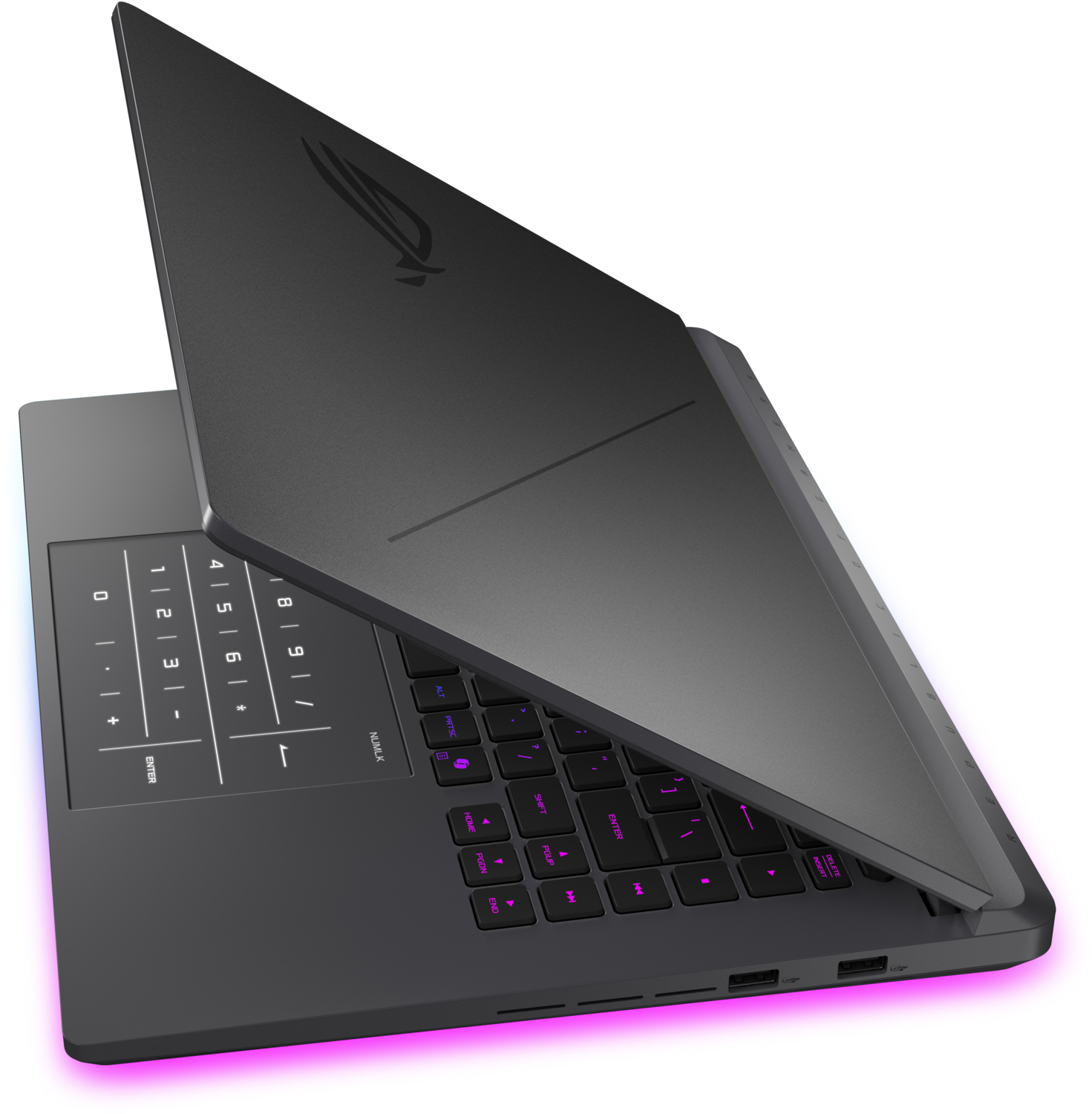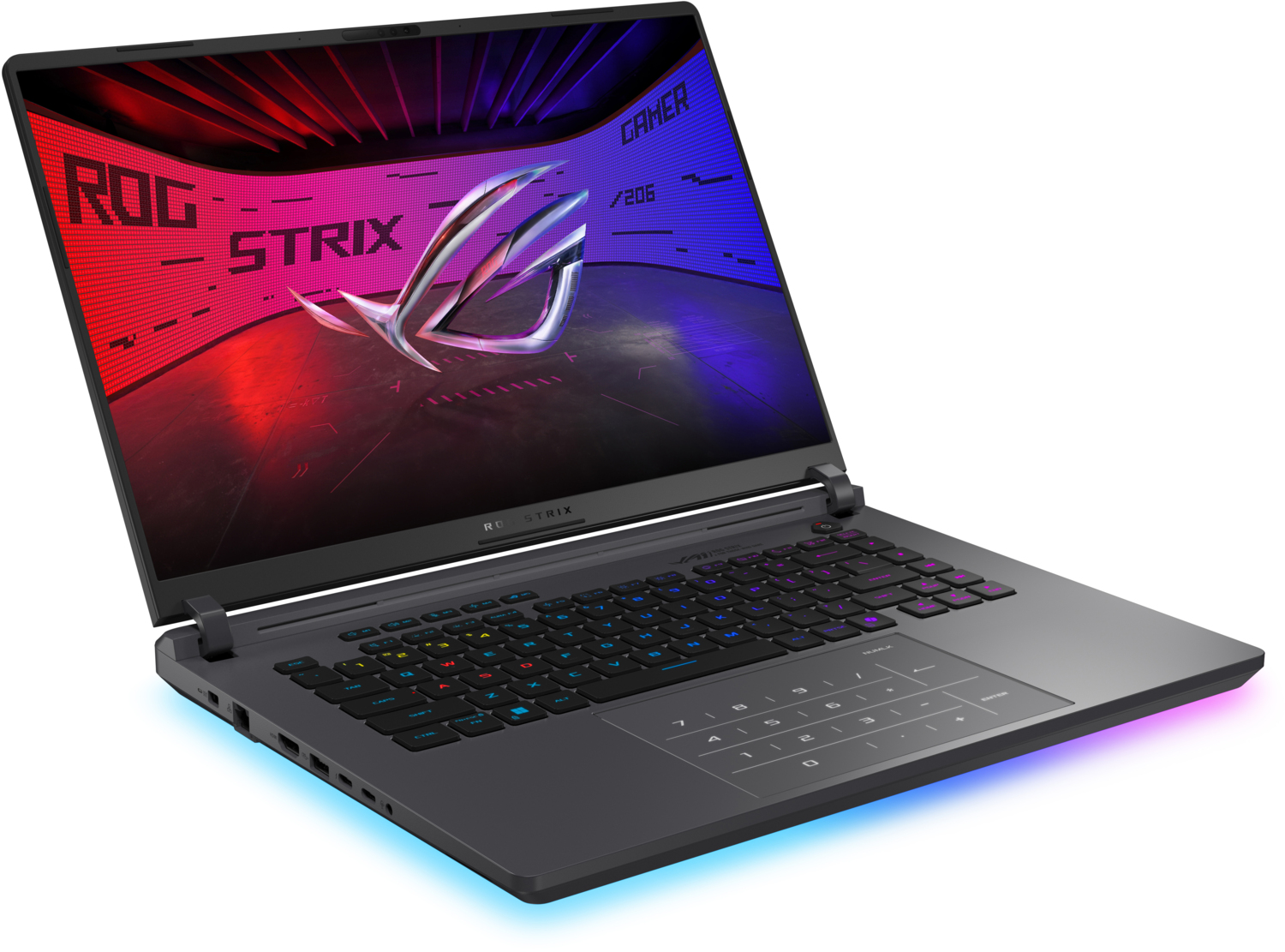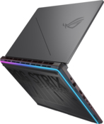 Ноутбук 2025 ROG Strix G16 оснащений RGB-підсвічуванням, що обрамляє усю нижню панель корпусу, створюючи яскраве світіння на столі. Це підсвічування може синхронізуватися з іншими периферійними пристроями ROG.