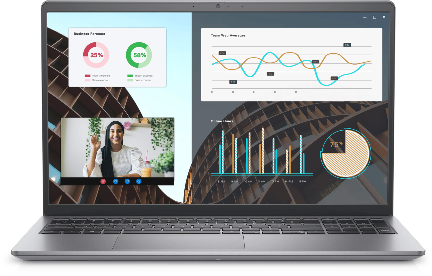 Оновлений алюмінієвий чохол пропонує безліч функцій у витонченому дизайні. Коли ви знімаєте на камеру, нова FHD веб-камера з широким динамічним діапазоном і функцією тимчасового шумозаглушення допоможе вам виглядати якнайкраще. Крім того, завдяки вбудованому подвійному мікрофону та штучному інтелекту, який зменшує фоновий шум, ви можете говорити так само чітко, як під час телефонної розмови. Крім того, аудіо на основі штучного інтелекту в MyDell оптимізує звук, щоб ви могли чітко чути й бути почутими. Для більшого душевного спокою, механічний затвор на камері захищає вашу конфіденційність.