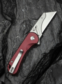 Модель оснащена канцелярським ножем замість класичного клинка, тому стане в пригоді не тільки для вирішення повсякденних завдань, а й для професійної діяльності. Тонке лезо акуратно й точно ріже картон, мотузки, вироби зі шкіри, пластику та гуми. У наборі є 3 змінні клинки ідентичної форми. Всі вони виготовлені з нержавіючої сталі 6Cr13, обробленої методом галтування для усунення блиску металу. Модель укомплектована замком button lock та керамічними підшипниками в осьовому вузлі. Клинок миттєво виймається з руківʼя при натисканні пружної кнопки та помаху кисті. Ніж можна відкрити й іншими способами: за допомогою шпеника або плавця фліпера.