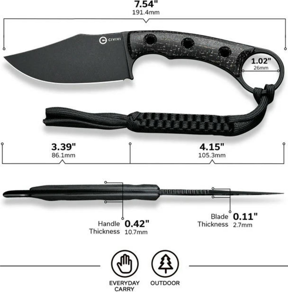 Лінійка фіксованих ножів Midwatch від Civivi включає кілька пар інструментів із різними матеріалами та відтінками конструкцій, серед них модель C20059B-1. Особливості ножа - універсальність у роботі, а також помітний і водночас практичний дизайн, завдяки якому модель легко використовувати для вирішення повсякденних завдань. C20059B-1 - це ніж фултанг із клинком clip point, що вирізняється різким скосом обуха у напрямку до вістря. Внаслідок цього клинком зручно виконувати різні типи робіт: пряме лезо довжиною 86,1 мм забезпечує точне різання, а тонкий кінчик підходить для проколювання матеріалів різної щільності.