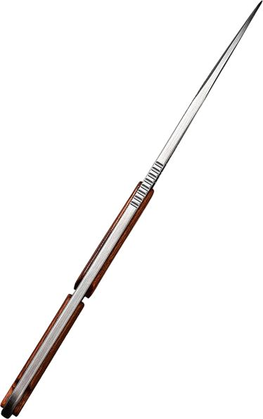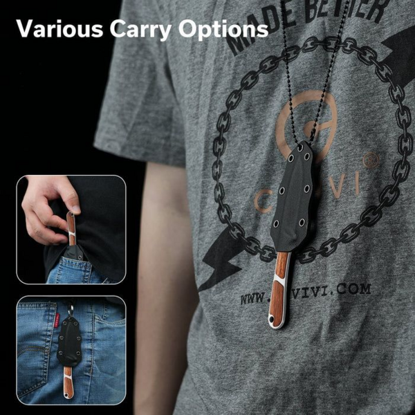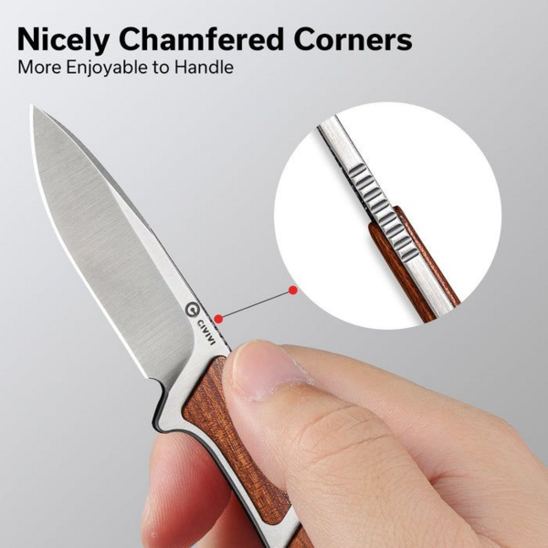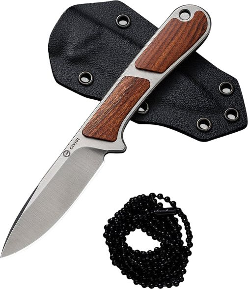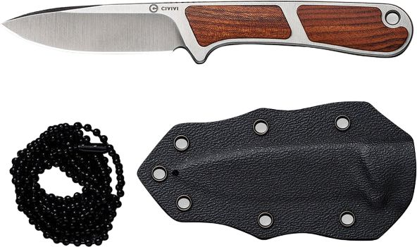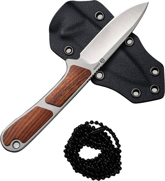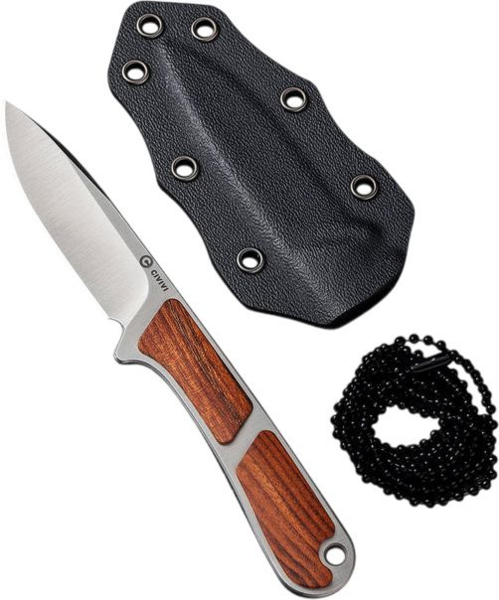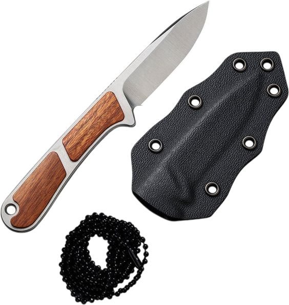 Ніж оснащений клинком зі сталі Nitro-V, яка не піддається іржавінню та витримує високі навантаження завдяки гартуванню до 59-61 HRC. Накладки з натуральної деревини на руківʼї є прикрасою дизайну та перешкоджають ковзанню конструкції в долоні. Інструмент поставляється в комплекті з піхвами з кайдекса та сталевим ланцюжком для носіння на шиї.