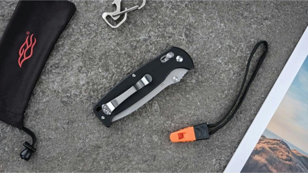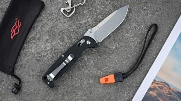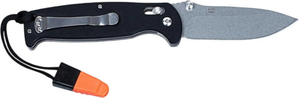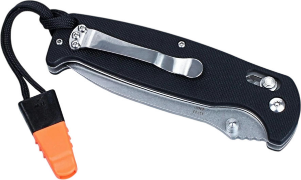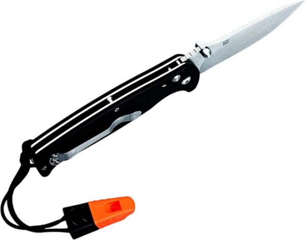 Ніж Ganzo G7412 розрахований на використання під час відпочинку на природі. Він має складну конструкцію, що робить ніж більш компактним і спрощує його транспортування. Клинок ножа виконаний з популярної марки нержавіючої сталі — 440С. Його поверхня оброблена за методом Stone Wash, через що на ній видно сліди від шліфувальних матеріалів. Цей тип обробки робить ножі майже не відблискуючими, а також на них набагато менше помітні невеликі подряпини. Ріжуча кромка ж заточена повністю гладко, щоб ніж рівно і легко різав практично будь-які матеріали. Повна довжина леза від вістря до обуха - 89 мм. Лезо досить міцне і по обуху його товщина дорівнює 3,3 мм. Решта довжини ножа 205 мм припадає на руків'я. Вона зроблена з пластику G10, який зараз є одним з найбільш популярних для цієї деталі матеріалів. Поверхня руків'я рівна, але для того, щоб вона не ковзала в руках, на пластик нанесений дрібний фактурний візерунок. До кожного руків'я вже приєднаний ремінець, на іншому кінці якого є невеликий свисток. Цей аксесуар цілком здатний вам допомогти, якщо під час відпочинку на природі буде потрібно подати звуковий сигнал окремим учасникам групи.