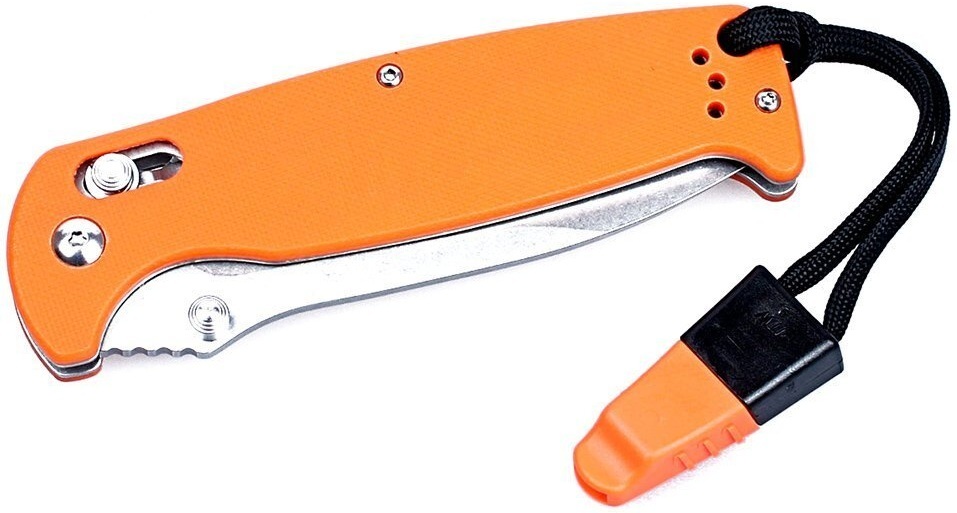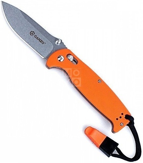 Ніж Ganzo G7412 розрахований на використання під час відпочинку на природі. Він має складну конструкцію, що робить ніж більш компактним і спрощує його транспортування. Клинок ножа виконаний з популярної марки нержавіючої сталі — 440С. Його поверхня оброблена за методом Stone Wash, через що на ній видно сліди від шліфувальних матеріалів. Цей тип обробки робить ножі майже не відблискуючими, а також на них набагато менше помітні невеликі подряпини. Ріжуча кромка ж заточена повністю гладко, щоб ніж рівно і легко різав практично будь-які матеріали. Повна довжина леза від вістря до обуха - 89 мм. Лезо досить міцне і по обуху його товщина дорівнює 3,3 мм. Решта довжини ножа 205 мм припадає на руків'я. Вона зроблена з пластику G10, який зараз є одним з найбільш популярних для цієї деталі матеріалів. Поверхня руків'я рівна, але для того, щоб вона не ковзала в руках, на пластик нанесений дрібний фактурний візерунок. До кожного руків'я вже приєднаний ремінець, на іншому кінці якого є невеликий свисток. Цей аксесуар цілком здатний вам допомогти, якщо під час відпочинку на природі буде потрібно подати звуковий сигнал окремим учасникам групи.