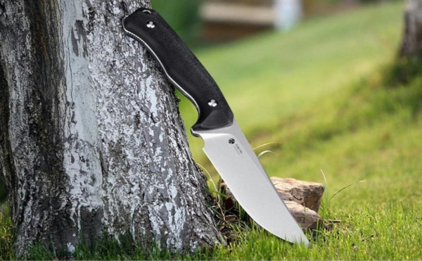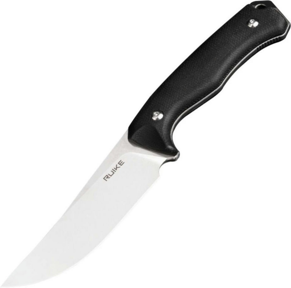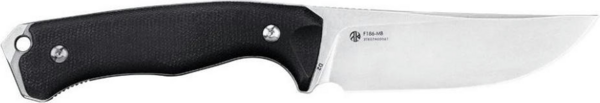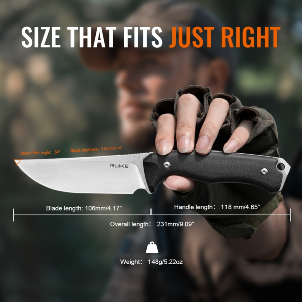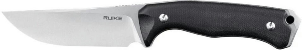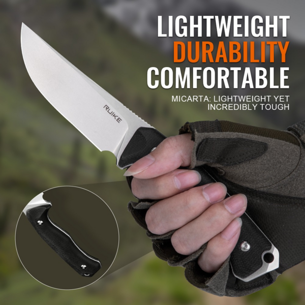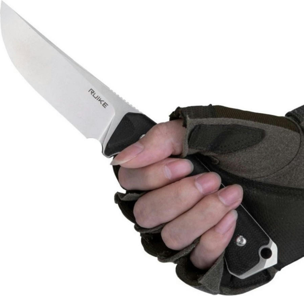 Ніж Ruike F186 досягає 231 мм у довжину та відрізняється лаконічним дизайном з витриманим балансом між ергономікою та довговічністю конструкції. Модель підходить не лише для використання на природі, але також легко справляється з повсякденними завданнями, для вирішення яких потрібне гостре та міцне лезо. Фіксований клинок має універсальний профіль straight back у нього різальна кромка та тонким вістрям, що спрощує виконання ножем колючо-різальних робіт. Для зручності використання під час силового різання на обух клинка нанесені дрібні насічки, що формують упор для великого пальця. Клинок виготовлений зі сталі D2, що характеризується відмінною міцністю, простотою в заточуванні та непоганою корозійною стійкістю. Завдяки твердості 59-61 HRC пряме лезо ефективно ріже матеріали різної щільності — від товстого картону до жорсткого пластику та навіть дрібних гілок. Обробка stonewash (гартування) робить метал напівматовим, внаслідок чого усуваються будь-які відблиски, а також маскуються відбитки пальців та дрібні потертості на клинку. Це перший ніж в асортименті Ruike, руківʼя якого виготовлене з мікарти. До переваг цього матеріалу відносяться стабільність при температурних перепадах, несприйнятливість до вологи та стійкість до пошкоджень у разі механічного впливу. Крім того, мікарта не вбирає запахи та не вицвітає з часом, зберігаючи первісний вигляд протягом усього експлуатаційного терміну. Накладки на руківʼї мають фігурну форму, що підвищує ергономіку конструкції. Ця особливість у поєднанні зі злегка шорсткою поверхнею мікарти робить утримання максимально надійним, без ковзання в долоні. Для додаткового підстрахування можна накидати на руку темляк (не входить до комплекту). Для кріплення темляка призначений отвір у хвості руківʼя.