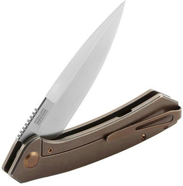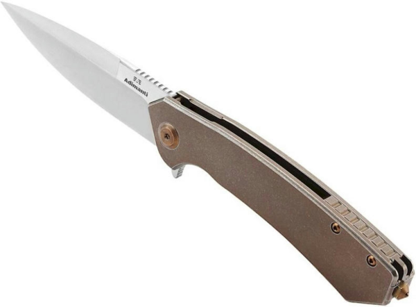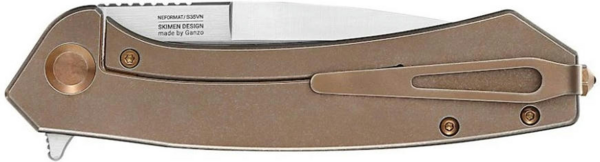 Модель є вдосконаленою версією ножа Ganzo з преміальної лінійки Adimanti, одного з бестселерів бренду. Оновлення торкнулося матеріалів, використовуваних у виробництві. Це зробило складну конструкцію ще більш витривалою і стійкою до корозії. Замість сталі D2, з якої виготовлені базові ножі Adimanti, клинок цієї версії виготовлено з мартенситної марки CPM S35VN, яка є найпопулярнішим матеріалом у ножовій промисловості завдяки надійності та продуктивності, якими наділяє клинки ця сталь. Завдяки однорідній структурі з включенням 14% хрому і 1.4% вуглецю метал стійкий до зносу і має високу опірність іржі, навіть якщо конструкція регулярно піддається впливу вологи. Лезо твердістю на рівні ±60 HRC демонструє стабільне різання без утворення дрібних дефектів, як-от деформація ріжучої крайки та поява відколів. Клинок із профілем drop point досягає 8.5 см у довжину, а товщина обуха дорівнює 3.5 мм. Щоб вийняти лезо з рукояті, досить натиснути на плавник фліппера. Під час виконання силових робіт користувач може покласти великий палець на ребристий упор, що знаходиться біля основи клинка. Матеріал рукоятки - титан із покриттям коричневого відтінку. Серед переваг титану: висока питома міцність і мала щільність, що сприяє зниженню загальної ваги ножа до 92.3 г проти 120 г у базових моделей. Крім того, титан характеризується надзвичайною корозійною стійкістю, оскільки на його поверхні є найтонша оксидна плівка. Ця плівка запобігає окисленню металу в разі потрапляння на поверхню крапель води, кислот і масел. У відкритому положенні довжина ножа досягає 20.5 см. Конструкцію доповнено однопозиційною кліпсою глибокої посадки, що повністю приховує інструмент у кишені. У хвості є склобій для застосування в екстреному випадку.