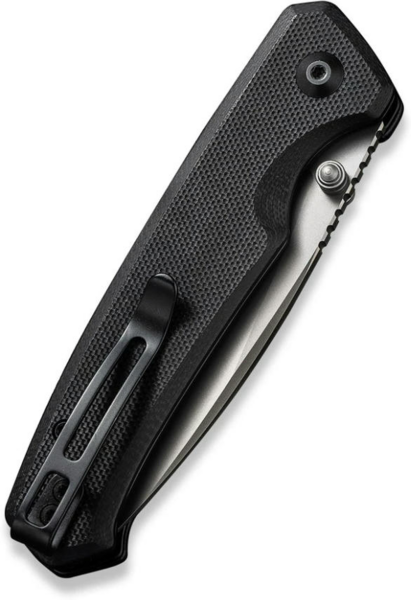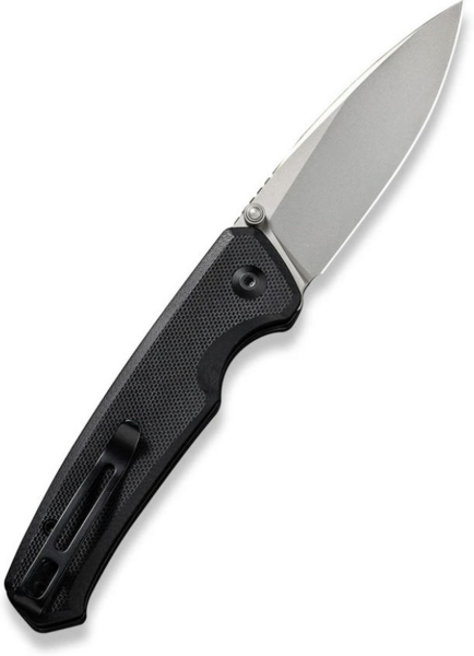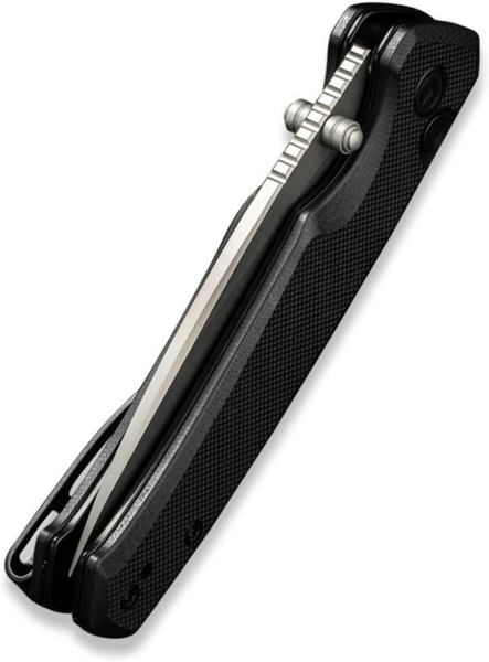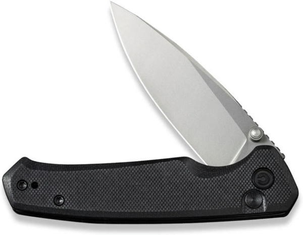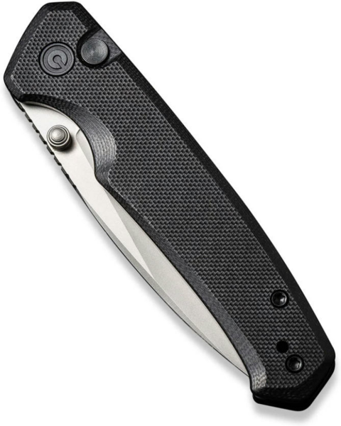 Лезо з прямою різальною крайкою відкривається натисканням круглої кнопки замку button lock і різким помахом запʼястя. Фіксація відрізняється надійністю, тому можна не хвилюватися, що ніж несподівано закриється під час експлуатації. Також доступний інший спосіб відкривання, який пропонує двосторонній шпеник зі сталі. Композит характеризується стійкістю до механічних пошкоджень, а скошені краї плашок дозволяють утримувати руківʼя без появи почуття дискомфорту та натирання шкіри долоні.