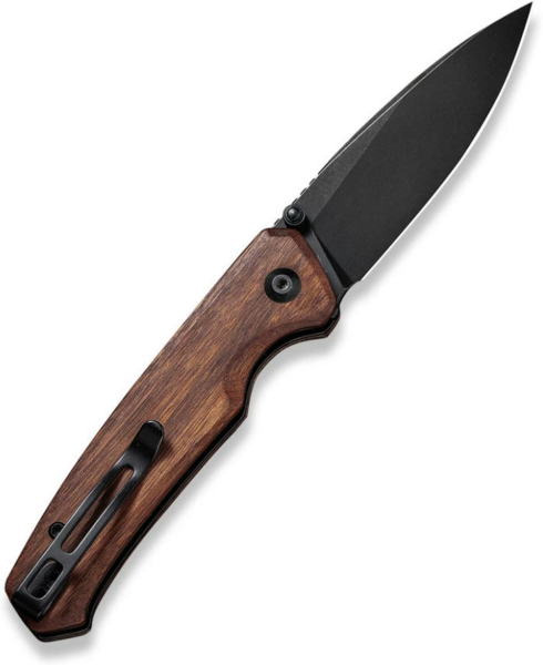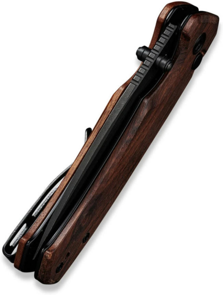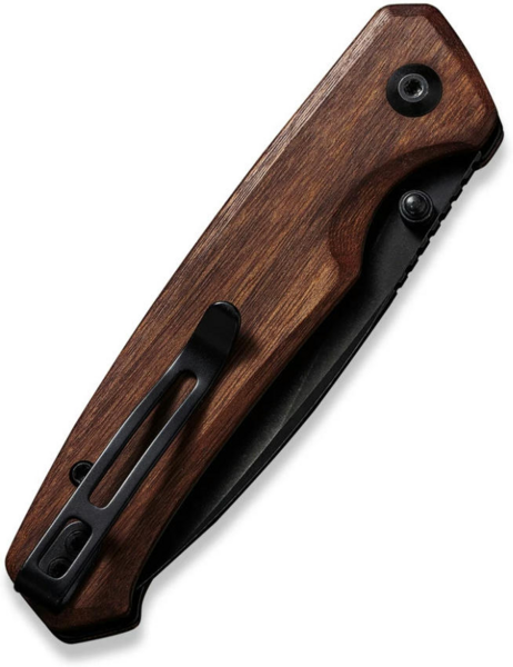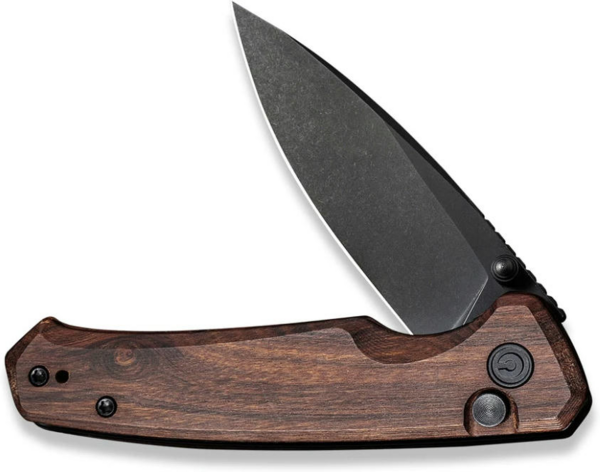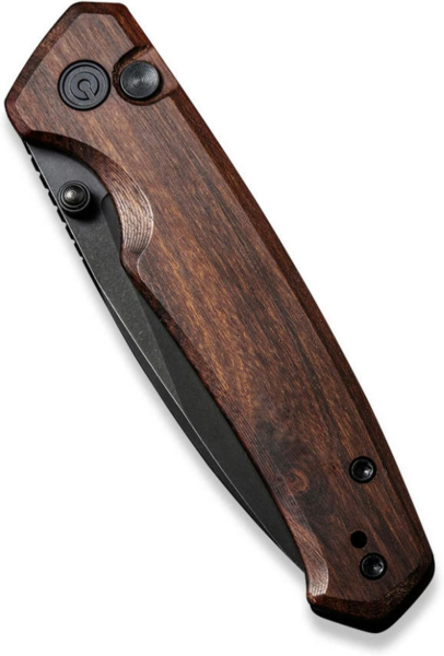 Лезо з прямою різальною крайкою відкривається натисканням круглої кнопки замку button lock і різким помахом запʼястя. Фіксація відрізняється надійністю, тому можна не хвилюватися, що ніж несподівано закриється під час експлуатації. Також доступний інший спосіб відкривання, який пропонує двосторонній шпеник зі сталі. Дизайн інструменту прикрашають накладки з натуральної деревини. Деревина характеризується міцністю, а відполірована поверхня зі скошеними краями дозволяє утримувати руківʼя без появи почуття дискомфорту та натирання шкіри долоні.