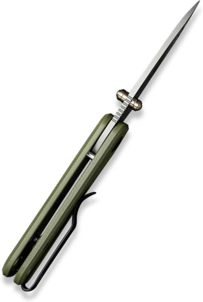 Клинок із прямим заточуванням розкривається за допомогою шпеника, який виготовлений з титану 6AL4V з блакитним покриттям. Додатковий комфорт експлуатації забезпечують рифлений упор під палець на обуху та виїмка під вказівний палець, що захищає від зісковзування руки на лезо. Склотекстолітові плашки на руківʼї не тріскаються у разі удару, не змінюють колір та форму під впливом сонячних променів, олій, кислот. Краї спеціально закруглені, щоб руківʼя не давило долоню. У хвості конструкції є двопозиційний затискач з нержавіючої сталі та широкий отвір для темляка.