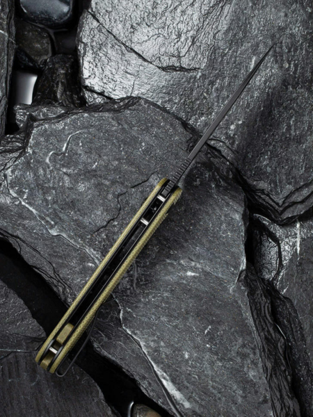 Лезо моделі має форму drop point, яка дуже зручна як при виконанні ріжучих, так і колючих операцій. В основі клинка – сталь марки Sandvik 14C28N. Даний матеріал характеризується стійкістю до корозії та легко піддається заточуванню. Це досить міцна ножова сталь. Ручка ножа виготовлена із застосуванням мікарти. Композитний матеріал із льону та синтетичної смоли.