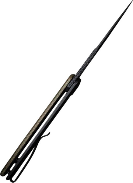 Цей тип клинка демонструє підвищену проникну здатність і підходить для здійснення точкових проколів. До того ж гостре лезо дозволяє різати матеріали різної щільності тонко й акуратно. Сталь 14C28N виступає матеріалом клинка. Це нержавіюча марка, розроблена шведською компанією Sandvik Stainless спеціально для виробництва ножів. Сплав твердістю на рівні 58-60 HRC наділяє різальну стійкість до пошкоджень. Гартування клинка (stonewash) робить поверхню сталі неоднорідною, матовою, а чорне покриття є яскравою прикрасою дизайну. Товщина клинка в обуху дорівнює 3 мм. Плавець фліпера дозволяє відкривати лезо однією рукою, фіксуючи його за допомогою замка frame lock. В основі механізму відкривання знаходяться кулькові підшипники з кераміки. Плашка з мікарти з одного боку мінімізує ковзання ножа у долоні. З іншого боку оголена сталева конструкція руківʼя, доповнена кліпсою Tip-Up. Кліпса закріплена двома гвинтами та не передбачає зміни положення.