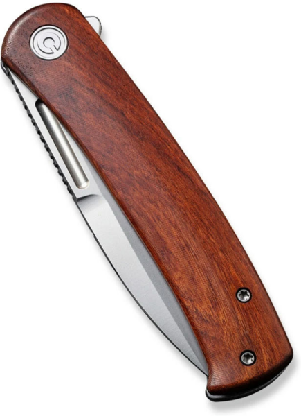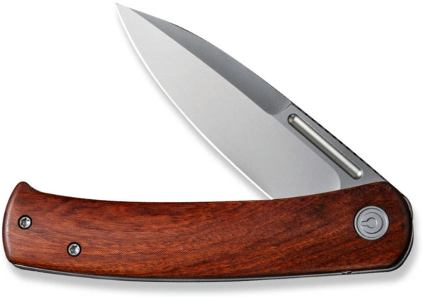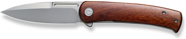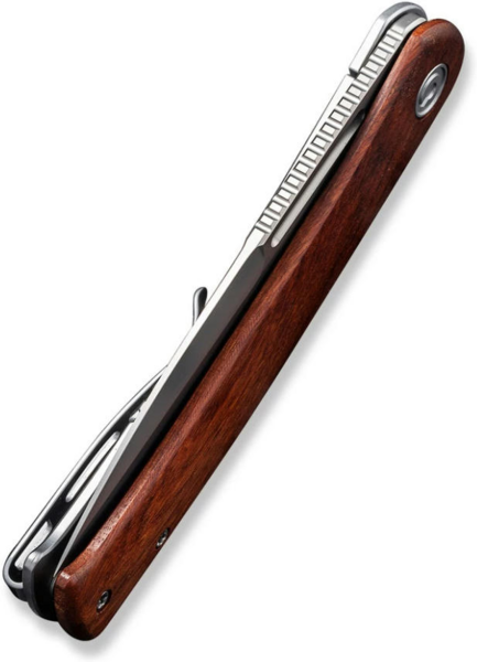Товщина клинка в обуху дорівнює 3 мм. Фліпер дозволяє відкривати лезо однією рукою, фіксуючи його за допомогою замку frame lock. Плашка з натуральної деревини гібуртії з одного боку мінімізує ковзання ножа у долоні. З іншого боку оголена сталева конструкція руківʼя, доповнена кліпсою Tip-Up. Кліпса закріплена двома гвинтами та не передбачає зміни положення.