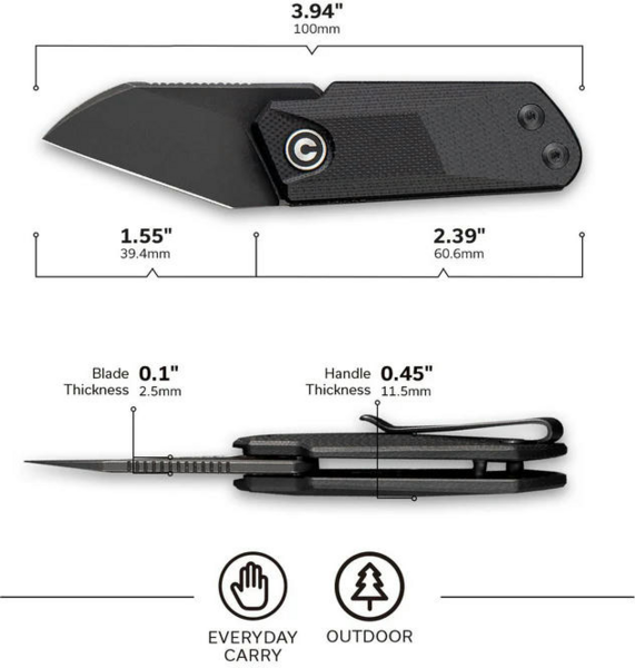 Мініатюрний інструмент Civivi Ki-V є заміною повноформатним аналогам. Його максимальна довжина становить не більше 100 мм, тому він не належить до категорії холодної зброї та підходить для непомітного носіння в кишені. Клинок має незвичайну форму зі скошеним лезом, що візуально нагадує перевернутий ніж clip point. Він підходить для виконання тонких й акуратних надрізів, наприклад, паперу або картонного паковання. Для цього також передбачений довгий упор під палець посеред обуха. Довжина клинка дорівнює 39.4 мм при товщині 2.5 мм.
