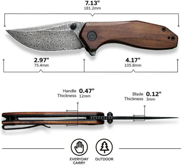 Довжина клинка дорівнює 75.4 мм, а товщина — 3 мм. Він має форму clip point з піднятим кінчиком, що підвищує точність різання. В основі клинка є невеликий упор під великий палець. Конструкція відкривається декількома способами: за допомогою сталевого плавця або шпеника, розташованого по обидва боки клинка.