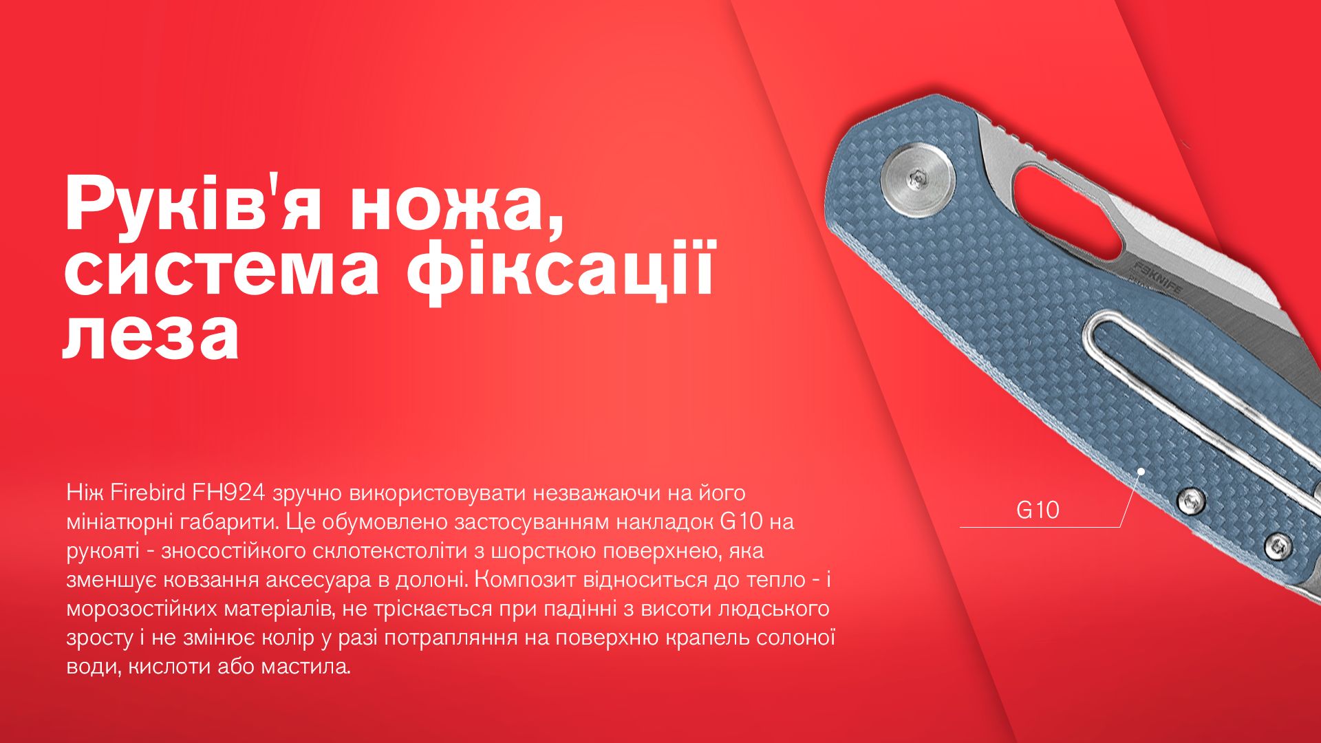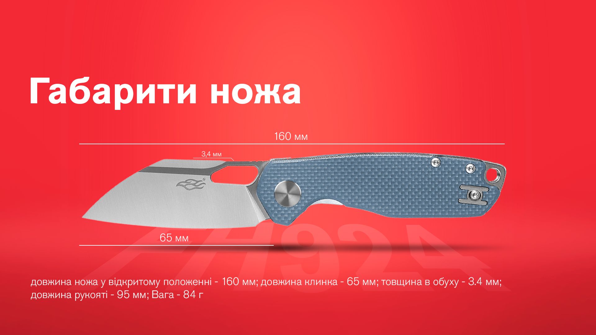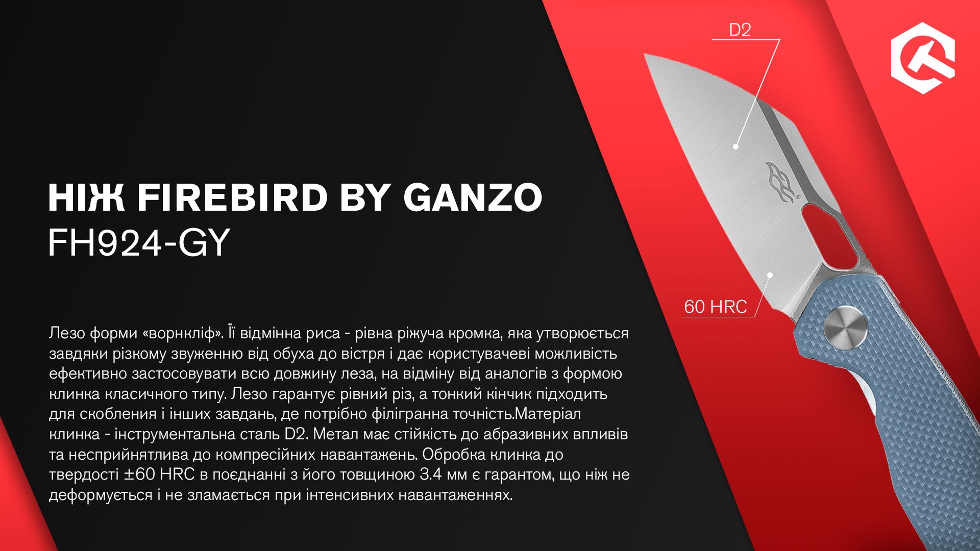 Ніж Firebird FH924 підходить для будь-яких видів діяльності, що вимагають гострого і надійного в експлуатації інструменту. Клинок зі сталі D2 має довжину 65 мм і замикається за допомогою замка Liner lock, що витримує навантаження близько 70 кг.