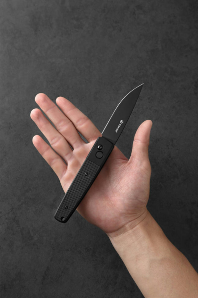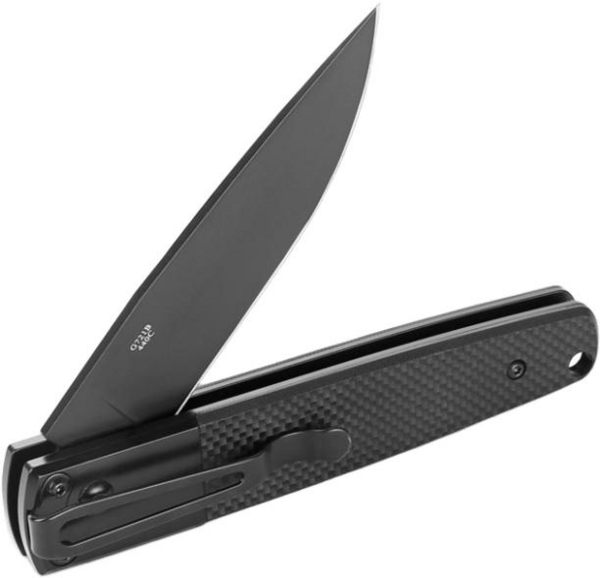 - Сталь 440С в клинку має нержавіючі властивості та надовго зберігає гостроту після заточування, тому не вимагає спеціального догляду. До того ж метал загартований до твердості ±58 HRC, що в сукупності з чорним зміцнювальним покриттям підвищує ефективність роботи зі щільними матеріалами, як пластик або деревина.