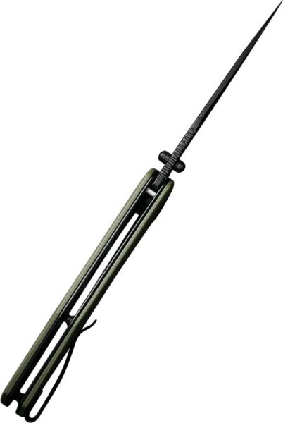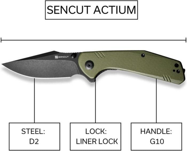Серія ножів Actium — одна з перших лінійок інструментів бренду Sencut, що побачив світ у 2020 році. До неї входять три пари складаних моделей з ідентичним дизайном і відмінностями у вигляді використовуваних матеріалів та їх відтінків. Є класичним варіантом складаного ножа із сатиновим клинком і чорним руківʼям злегка вигнутої форми. Лезо можна витягнути за допомогою натискання на фліперу або на круглий шпеник, що має чорне покриття, яке виділяє елемент на тлі клинка класичного кольору «металік». Плавність ковзання леза забезпечує підшипник зі зносостійкими керамічними кульками. Повнорозмірний клинок drop point із прямим лезом підходить для різання матеріалів різної щільності — від паперу та харчових продуктів до жорсткого пластику й навіть деревини. Довжина клинка дорівнює 88 мм. Насічки на 3-міліметровому обуху виконують роль упору для великого пальця. При такому хваті підвищується контроль над ножем та, як наслідок, безпека під час виконання особливо складних робіт. Матеріал леза — сталь D2, знайома через свою популярність. Баланс легувальних елементів у складі наділяє метал корозійною стійкістю та міцністю, а термообробка марки збільшує її твердість до 59-61 HRC. Пружна пластина замка liner lock фіксує відкритий клинок, не даючи йому зміститися вниз і порізати пальці. Руківʼя сформоване в тому числі зі сталевих плашок зі склотекстоліту G10, який не боїться механічного впливу та не вбирає запахи. Приємна, злегка шорстка на дотик поверхня композиту дає можливість використовувати ніж протягом тривалого часу без натирання чутливої шкіри долоні. Сталева кліпса Tip-Up — стандартний аксесуар, що є в більшості інструментів Sencut і материнської компанії We Knife. За допомогою кліпси можна кріпити ніж на одязі, лямці рюкзака або сумці для запобігання втраті інструменту, вага якого становить рівно 110 грамів.