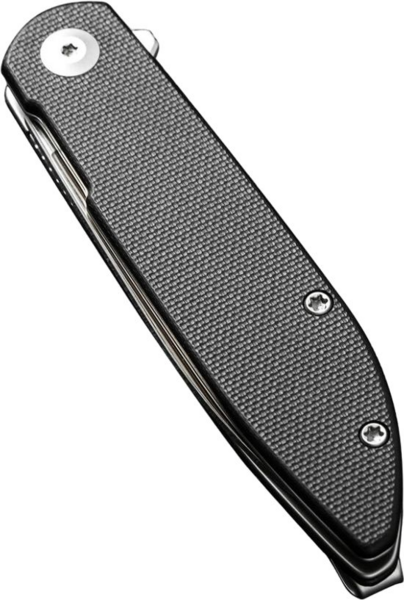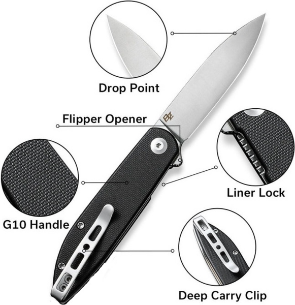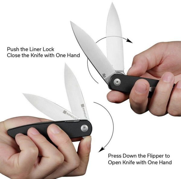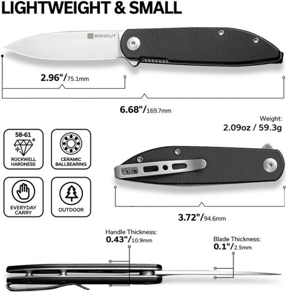 У випадку з ножем Sencut Bocll це значення ледве досягає 59.3 грамів, що разом з однопозиційною кліпсою зі сталі спрощує носіння аксесуара в сумці або на кишені одягу. Для виробництва клинка обрано сталь D2. У металі міститься 11% хрому, що допомагає в боротьбі з появою корозії, та 1.5% вуглецю, який підвищує міцність леза та його стійкість до зношування. Сатиновий фініш клинка з характерним штриховим узором приховує подряпини й плями на поверхні, включаючи відбитки пальців. Профіль drop point вважається однією з найуніверсальніших та довговічних форм клинка. Пряма різальна крайка забезпечує рівний зріз, а кінчик підходить для здійснення акуратних проколів. Обух, що плавно звужується до вістря, сприяє рівномірному навантаженню на клинок завдовжки 75.1 мм, що зводить до мінімуму ризик деформування леза та утворення сколів. Інструмент відкривається єдиним способом, за допомогою сталевого плавця (фліпера), і замикається замком liner lock. Плавність відкривання забезпечується в осьовому вузлі. Склотекстолітові плашки на руківʼї перешкоджають ковзанню ножа в долоні. Зручності захоплення також сприяє товщина руківʼї, що дорівнює 10.9 мм. Довжина складеної конструкції дорівнює 94.6 мм.