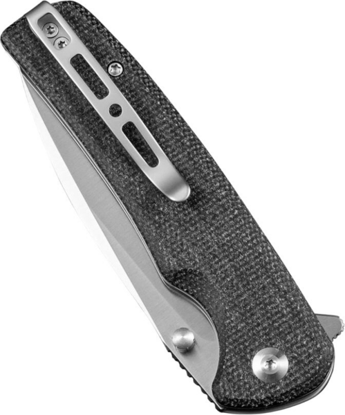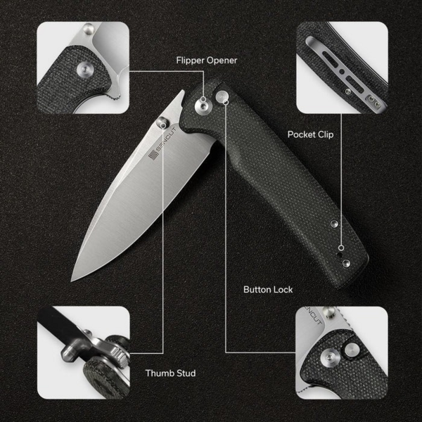 Користувач може відкривати складану конструкцію за допомогою фліпера, що є двостороннім. При відкритому ножі фліпер виступає мінізахистом від зісковзування долоні на лезо. Запірний механізм — замок button lock. Під кнопкою блокування знаходиться пружина, що чинить достатній опір, щоб уникнути випадкового відкривання інструменту. У разі виконання особливо складного завдання на обуху передбачено рельєфний упор під великий палець. Матеріал руківʼя — мікарта. Скошені краї плашок не натирають шкіру долоні, а плавні вигини передньої частини підвищують надійність захоплення. Конструкція обладнана двостороннім затискачем на кишеню, який робить носіння зручним і запобігає випадковій втраті інструменту.