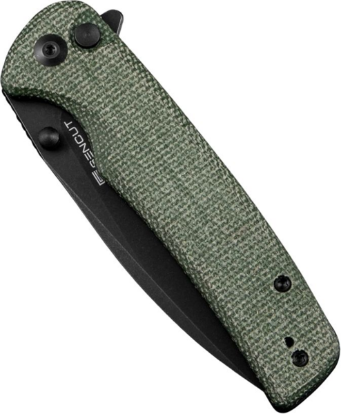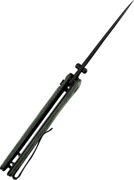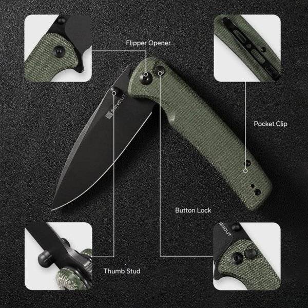 Користувач може відкривати складану конструкцію за допомогою фліпера, що є двостороннім. При відкритому ножі фліпер виступає мінізахистом від зісковзування долоні на лезо. Запірний механізм — замок button lock. Під кнопкою блокування знаходиться пружина, що чинить достатній опір, щоб уникнути випадкового відкривання інструменту. У разі виконання особливо складного завдання на обуху передбачено рельєфний упор під великий палець. Матеріал руківʼя — мікарта. Скошені краї плашок не натирають шкіру долоні, а плавні вигини передньої частини підвищують надійність захоплення. Конструкція обладнана двостороннім затискачем на кишеню, який робить носіння зручним і запобігає випадковій втраті інструменту.