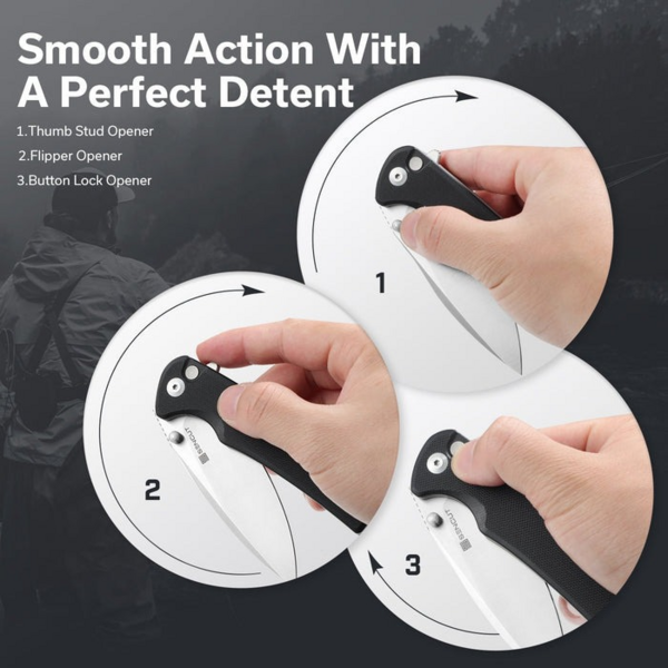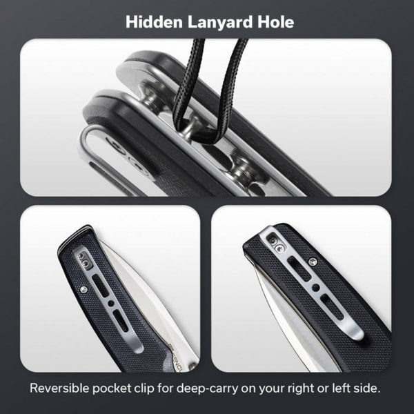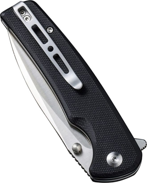 Користувач може відкривати складану конструкцію за допомогою фліпера, що є двостороннім. При відкритому ножі фліпер виступає мінізахистом від зісковзування долоні на лезо. Запірний механізм — замок button lock. Під кнопкою блокування знаходиться пружина, що чинить достатній опір, щоб уникнути випадкового відкривання інструменту. У разі виконання особливо складного завдання на обуху передбачено рельєфний упор під великий палець. Матеріал руківʼя — мікарта. Скошені краї плашок не натирають шкіру долоні, а плавні вигини передньої частини підвищують надійність захоплення. Конструкція обладнана двостороннім затискачем на кишеню, який робить носіння зручним і запобігає випадковій втраті інструменту.