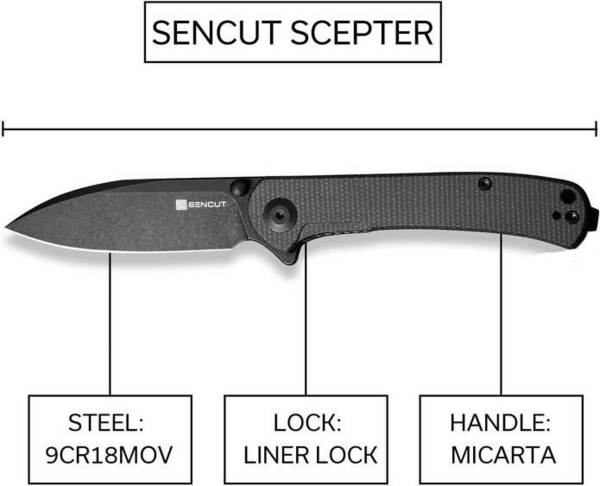Ніж виготовлений з високоякісної легованої сталі. Метал збагачений вуглецем, що забезпечує гарний захист від корозії, ніж довго залишається гострим без додаткової заточки. Крім того, елементом виступає молібден та ванадій, внаслідок цього сплав менш ламкий та стійкий до навантажень. Лезо відрізняється міцністю і гостротою. Завдяки відшліфованому покриттю стають непомітними невеликі порізи, які з’являються при регулярному використанні. Варто звернути увагу на ергономічний дизайн. Ручка має реверсивний глибокий затиск для кишень і отвір для шнурка. Завдяки цьому роблять цей ніж легко зафіксувати на поясі, а також є можливість виконання будь-яких завдань з максимальним комфортом. Накладки ручки ножа виготовлені з Мікарту – незвичайно міцного матеріалу. Він складається з декількох шарів різних тканин (переважно лляних), що заливаються спеціальною смолою і під тиском твердіє. Смола, армована товстим шаром тканини, міцна та довговічна, такий матеріал не боїться вологи та великих температур. Завдяки такому покриттю ніж приємно тримати в руці, але деяким Мікарта може здатися злегка слизькою. Відкрити ніж можливо навіть однією рукою. Такий функціонал забезпечує керамічний кульковий підшипник. Ніж Sencut Scepter SA03F добре підходить для виконання різноманітних завдань під час полювання, активного відпочинку, кемпінгу або риболовлі. Проста конструкція та гостре лезо – все що потрібно для виконання складних задач в польових умовах. Конструкція проста, але надійна, такий виріб точно прослужить довго.