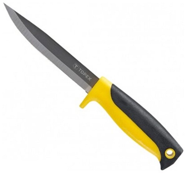 TOPEX нож универсального типа, больше длина лезвия - 120 мм, но оно очень острое и гладко заточенное. Оформил его здесь на сайте, мне продавец его порекомендовал и я не смог отказаться от покупки. 98Z103 модель в чехольчике, сталь не ржавеет со временем, но весьма тонкая - при использовании кончина он поломался и теперь нож не острый. Рукоятка из пластмассы, во влажных руках не скользит вообще, кобура из кожи, не дает порезаться об нож. Им хорошо обрезать строительную пену, обои, лишний линолеум и прочее, я пользуюсь в домашнем обиходе часто - проблем никаких нет, обычно нож удобно хранится в чехле.