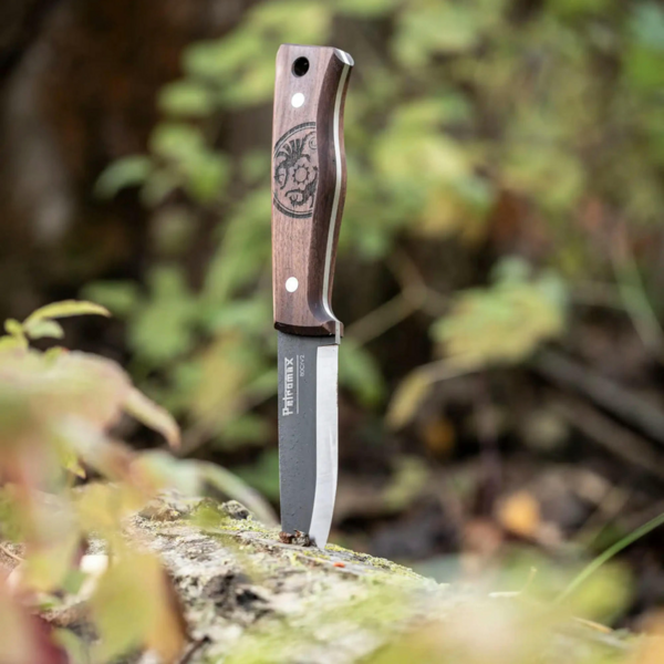 Універсальний ніж для бушкрафту і виживання від німецького бренду Petromax. Клинок з вуглецевої сталі витримує сильні удари й підходить для роботи з деревом. Скандинавське заточування допомагає робити контрольовані тонкі надрізи. Накладне горіхове руківʼя доповнено функцією антиковзання. Повний хвостовик (Full Tang) — найміцніша з ножових конструкцій.