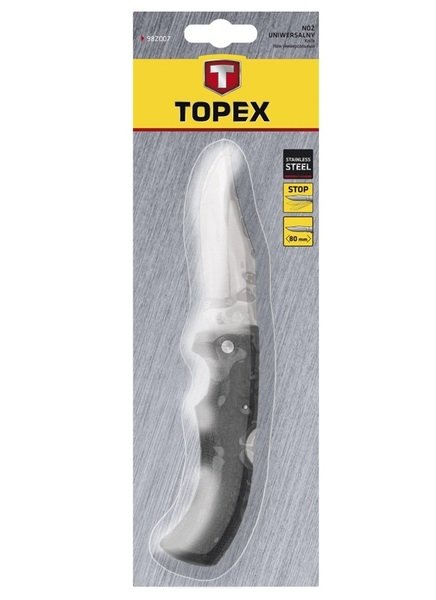 Ніж універсальний TOPEX з довжиною леза 100 мм. Корпус і лезо виготовлені з високоякісної нержавіючої сталі, що гарантує довгий термін служби інструменту. Блокування леза забезпечує безпеку під час експлуатації. Гумова рукоятка ергономічної форми добре лягає в долоню і невискальзивает, що підвищує комфорт роботи з ножем. Ніж складаний, що полегшує зберігання і транспорт. Бренд TOPEX призначений для домашніх майстрів.
