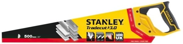 Ножівка для дерева з широким полотном Stanley Tradecut відмінно підійде для роботи з різними деревними матеріалами, такими як дошки, фанера, ДСП, МДФ, ламінат та інші. Ручка міцно кріпиться до леза за допомогою 3-х гвинтів, забезпечує високу безпеку і надійність інструменту. Різальне полотно ножівки має зубці середнього розміру, загартовані за технологією Tradecut, що забезпечує швидкий і водночас чистий зріз без зазубрин і дефектів. Завдяки оновленій технології заточення зубців, ножівка залишається гострою у два рази довше. Відполіроване полотно ножівки виконане з якісної нержавіючої сталі, має високі механічні характеристики й забезпечує зносостійкість інструменту. Висока антикорозійна стійкість матеріалу гарантує можливість використання ножівки у вологому середовищі. Двокомпонентна ручка ножівки виконана з гуми та пластику, зручно лежить в руці й перешкоджає ковзанню. Конструкція руків'я передбачає спеціальний кут в нижній частині, який дозволяє відкладати на заготовках кути 45 і 90 градусів.