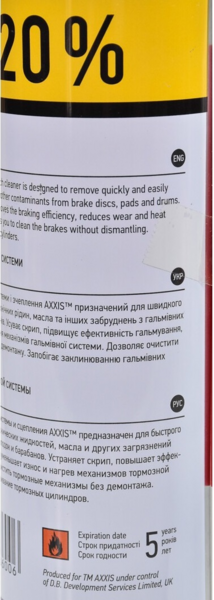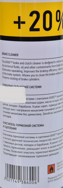 Очисник гальмівної системи та зчеплення AXXIS призначений для швидкого та легкого видалення технічних рідин, олії та інших забруднень з гальмівних дисків, колодок та барабанів. Усуває скрип, підвищує ефективність гальмування, зменшує знос та нагрівання механізмів гальмівної системи. Дозволяє очистити гальмівні механізми без демонтажу. Запобігає заклиненню гальмівних циліндрів