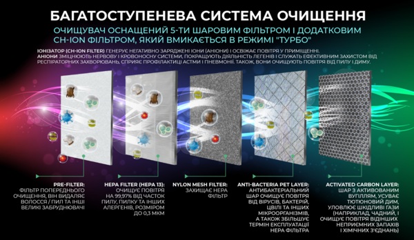 | Очищення | Від алергенів, Від вірусів та бактерій, Від газів і кіптяви, Від запахів, Від пилу, Від тютюнового диму, Від шерсті тварин |