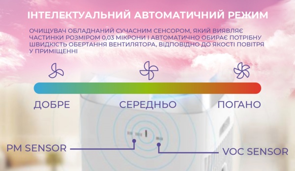 Ключовий параметр для оцінки якості повітря та його загрози для здоров'я людини. Показники цього датчика є змога виводити на дисплей навіть при вимкненому очищувачі, натиснувши на кнопку "PM2.5" на сенсорній панелі управління. Яскравість ж самого дисплея можна регулювати кнопкою "Light". Якщо концетрація забруднювачів в приміщенні буде висока - це "розсердить" очищувач та він буде світиться червоним, це дозволить вам вчасно вжити заходів з вибору потрібної інтенсивності очищення. Але рекомендується використовувати очищувач в автоматичному режимі, що б пристрій спираючись на показники датчиків сам вибирав потрібну швидкість вентилятора.