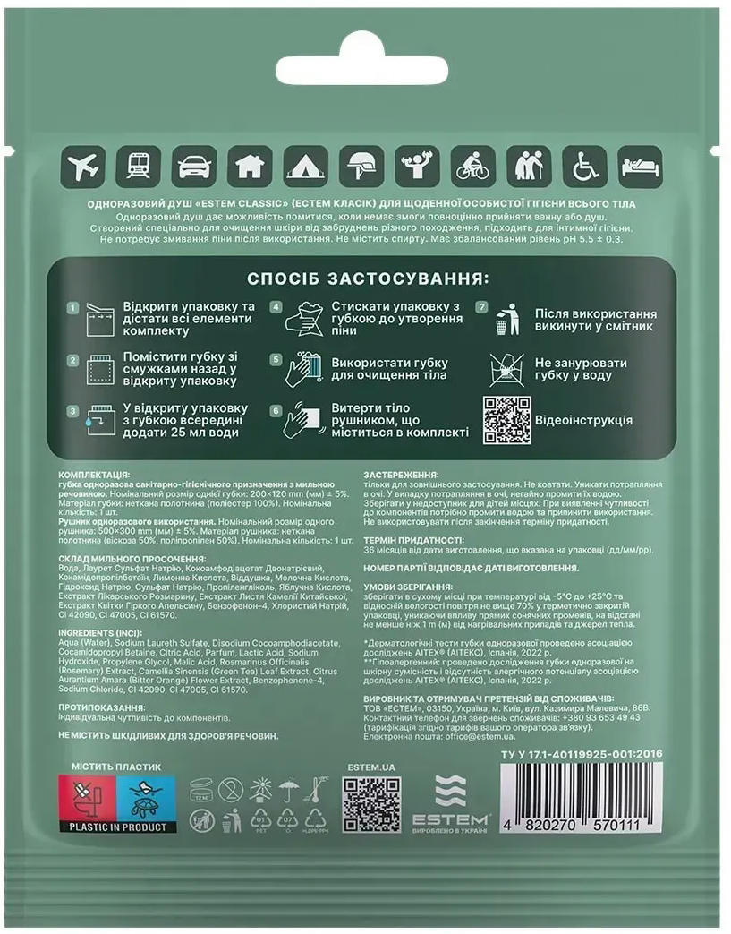 Одноразовий душ Estem Classic ідеально підходить для підтримки особистої гігієни в умовах, коли доступ до води обмежений. Кожен комплект включає мильну губку і рушник, що забезпечують швидке та ефективне очищення шкіри в будь-яких ситуаціях.